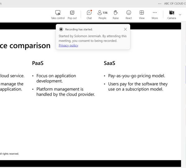 With a total number of 190 students in attendance ( 136 teams users and 54 tiktok live attendees), Solomon Francis Jeremiah took the students on a foundational overview of Cloud Computing starting from the question, “what is cloud computing?”